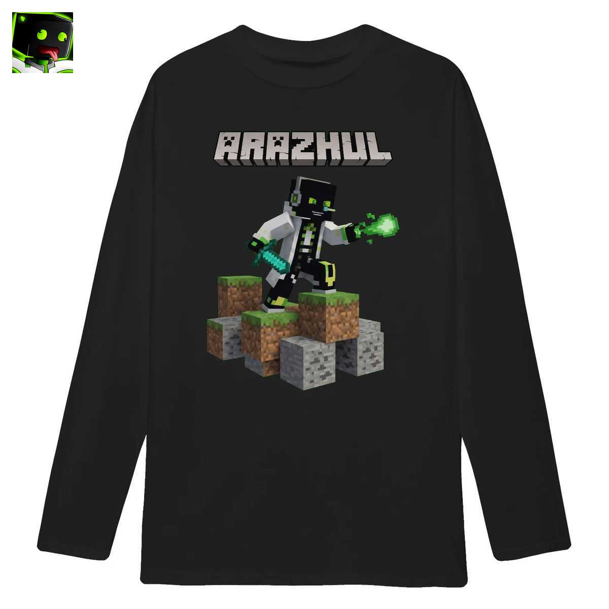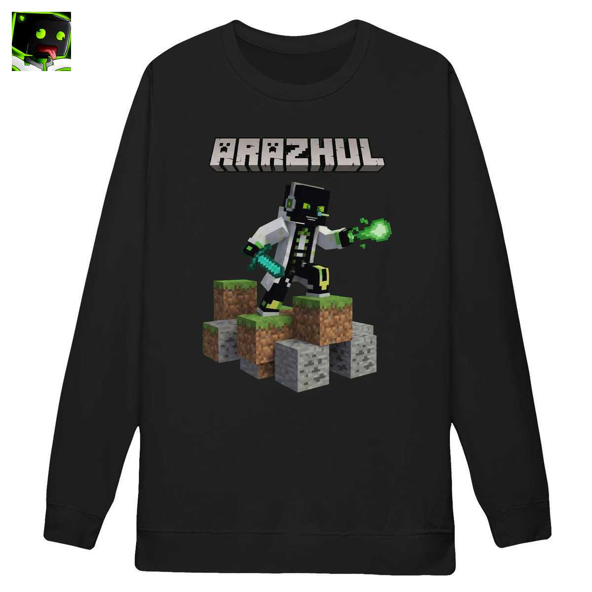 Die Szene ist dynamisch und detailreich gestaltet: Der Held steht auf einem Stapel aus den ikonischen Gras- und Steinblöcken, die sofort an die Welt von Minecraft erinnern. Dieser Hintergrund schafft eine direkte Verbindung zur Gaming-Kultur und den Ursprüngen von Arazhuls Content. Über der gesamten Szene thront der massive „ARAZHUL“ Schriftzug in 3D-Blockbuchstaben, der keinen Zweifel daran lässt, wem deine Loyalität als Fan gilt. Dieses T-Shirt erzählt eine Geschichte. Es erinnert an epische Kämpfe an der Seite von Freunden wie Glubbux und Geist oder die verrückten Erfindungen von Professor Nase. Es ist eine Einladung, Teil dieser Welt zu sein und die Abenteuer deines Pixelhelden stolz auf der Brust zu tragen. Für jeden, der mit ArazhulHD aufgewachsen ist, ist dieses Shirt ein Stück Nostalgie und ein Zeichen der Zugehörigkeit zur starken Arazhul Community.